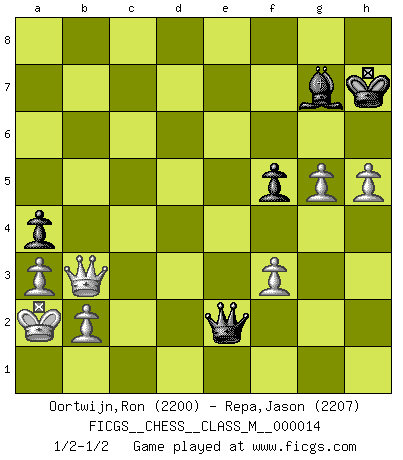 Last move : 1/2-1/2 2008 January 25 12:35:40 [Event "FICGS__CHESS__CLASS_M__000014"] [Site "FICGS"] [Date "2007.10.10"] [Round "1"] [White "Oortwijn,Ron"] [Black "Repa,Jason"] [Result "1/2-1/2"] [WhiteElo "2200"] [BlackElo "2207"] 1.e4 e6 2.d4 d5 3.Nd2 c5 4.exd5 Qxd5 5.Ngf3 cxd4 6.Bc4 Qd6 7.Qe2 Nf6 8.Nb3 Nc6 9.Bg5 Qb4+ 10.Bd2 Qb6 11.O-O-O Bd7 12.Bg5 h6 13.Bxf6 gxf6 14.Nfxd4 O-O-O 15.Kb1 Nxd4 16.Rxd4 f5 17.Rd2 Bg7 18.Rhd1 Bc6 19.g3 Rxd2 20.Rxd2 Rd8 21.Rxd8+ Kxd8 22.c3 a6 23.Kc1 Bg2 24.Nd2 Bf8 25.Bd3 Qc5 26.Nb3 Qd5 27.Qe3 Be7 28.h4 Ke8 29.Kc2 Qf3 30.Qd4 Bf8 31.Qa4+ Qc6 32.Qd4 Qd7 33.Qe5 Qd6 34.Qe3 Qd5 35.Qe2 Bf3 36.Qe3 Bg4 37.a3 h5 38.c4 Qh1 39.Nd4 Qd1+ 40.Kc3 Bg7 41.Bc2 Qa1 42.Kb3 Bf6 43.Qf4 Kf8 44.Qh6+ Bg7 45.Qg5 Kg8 46.Qd8+ Kh7 47.Qd7 Bd1 48.Qxf7 Qb1 49.Bxd1 Qxd1+ 50.Ka2 Qxd4 51.Qxh5+ Bh6 52.Qf7+ Qg7 53.Qxe6 Qg4 54.Qf7+ Bg7 55.c5 Qe4 56.h5 a5 57.f3 Qe5 58.Qxb7 Qxc5 59.g4 Qc4+ 60.Qb3 Qe2 61.g5 a4 1/2-1/2 French : Tarrasch, Open variation Queenside Castling by player White (move 11) Queenside Castling by player Black (move 14) This chess game ended in a draw. Follow this game move after move (download)Without error there can be no brilliancy. (Emanuel Lasker) Zeige mir drei Eröffnungsvarianten und ich beweise dir, dass zwei davon inkorrekt sind. (Emanuel Lasker) Después de una mala apertura, hay una esperanza en el juego medio. Pero una vez que estas en finales, el momento de la verdad ha llegado. (Edmar Mednis) Des combinaisons [dans le jeu d'échecs] pareilles à des mélodies. Je crois entendre pour ainsi dire la musique des coups... (Vladimir Nabokov) Waiting for chance ? Play in casinos. (FICGS proverb)