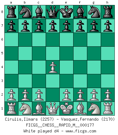 Last move : h4 2026 January 4 3:3:37 White clock - 47 days 03:45:16 Black clock - 12 days 06:34:03 [Event "FICGS__CHESS__RAPID_M__000177"] [Site "FICGS"] [Date "2025.11.18"] [Round "1"] [White "Cirulis,Ilmars"] [Black "Vasquez,Fernando"] [Result "*"] [WhiteElo "2257"] [BlackElo "2170"] 1.d4 Nf6 2.Nc3 d5 3.Bf4 e6 4.Nf3 c5 5.e3 a6 6.dxc5 Bxc5 7.Bd3 Nc6 8.O-O Bd6 9.Re1 Bc7 10.Bxc7 Qxc7 11.e4 d4 12.Ne2 e5 13.c3 dxc3 14.Nxc3 Be6 15.Nd5 Nxd5 16.exd5 Bxd5 17.Nxe5 O-O-O 18.Rc1 g6 19.Nxc6 Bxc6 20.Qb3 Rhe8 21.Be4 f5 22.Bxc6 Rxe1+ 23.Rxe1 Qxc6 24.h4 * Follow this game move after move (download)Capture of the adverse King is the ultimate but not the first object of the game. (William Steinitz) Karpov ist ein Museumsstück. (Garry Kasparov) El ganador de una partida es aquel jugador que hace el penúltimo error. (Savielly Tartakover) Nous vivons dans un monde échiquéen : chaque jour qui passe est un défi à relever. (Philosophe Sasha) He is a liar. I just don't know what the lie is yet. (Horatio Caine, C.S.I. Miami)