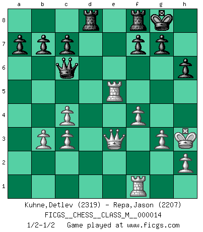 Last move : 1/2-1/2 2008 January 7 12:27:39 [Event "FICGS__CHESS__CLASS_M__000014"] [Site "FICGS"] [Date "2007.10.10"] [Round "1"] [White "Kuhne,Detlev"] [Black "Repa,Jason"] [Result "1/2-1/2"] [WhiteElo "2319"] [BlackElo "2207"] 1.c4 Nf6 2.Nc3 e5 3.Nf3 Nc6 4.d4 exd4 5.Nxd4 Bb4 6.Bg5 h6 7.Bh4 Bxc3+ 8.bxc3 Ne5 9.f4 Ng6 10.Bxf6 Qxf6 11.g3 Nf8 12.Bg2 Ne6 13.O-O O-O 14.e4 d6 15.Qd2 Nc5 16.Rae1 Bd7 17.Nb3 Rad8 18.e5 Nxb3 19.axb3 dxe5 20.Rxe5 Bc6 21.Qe3 Bxg2 22.Kxg2 Qc6+ 23.Kh3 1/2-1/2 English Opening Kingside Castling by player White (move 13) Kingside Castling by player Black (move 13) This chess game ended in a draw. Follow this game move after move (download)My opponents make good moves too. Sometimes I don't take these things into consideration. (Bobby Fischer) Mit sehr nachdenklichem Gesicht schreitet Bobby durch den Turniersaal. Was ist passiert?, fragt Lombardy. Ich stehe schlecht, antwortet Fischer. Lombardy: Dann biete doch einfach Remis an. Fischer: So schlecht stehe ich nun auch wieder nicht! (Robert James Fischer) La táctica fluye a partir de una posición superior. (Bobby Fischer) La vie est comme un jeu d'échecs : nous esquissons un plan, mais celui-ci est tributaire de ce que daignent faire l'adversaire aux échecs et le destin dans la vie. (Arthur Schopenhauer) All battles are fought by scared men who'd rather be someplace else. (John Wayne in the movie In harm's way)