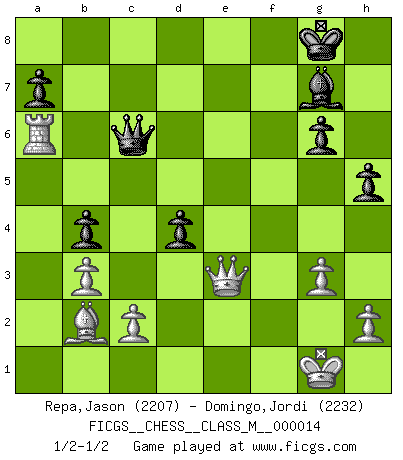 Last move : 1/2-1/2 2008 February 19 0:9:49 [Event "FICGS__CHESS__CLASS_M__000014"] [Site "FICGS"] [Date "2007.10.10"] [Round "1"] [White "Repa,Jason"] [Black "Domingo,Jordi"] [Result "1/2-1/2"] [WhiteElo "2207"] [BlackElo "2232"] 1.f4 d5 2.Nf3 Nf6 3.e3 g6 4.b3 Bg7 5.Bb2 O-O 6.Be2 b6 7.O-O Bb7 8.d3 c5 9.Ne5 Nfd7 10.d4 e6 11.Nd2 Nc6 12.Nxc6 Bxc6 13.Nf3 Rc8 14.a4 Qc7 15.Qe1 cxd4 16.Bxd4 f6 17.Ba6 Bb7 18.Bxb7 Qxb7 19.Rc1 Nc5 20.a5 b5 21.Qb4 Na6 22.Qd2 Rfe8 23.g3 b4 24.Ne1 e5 25.Bb2 Rc5 26.Nd3 Rxa5 27.fxe5 fxe5 28.Ra1 Rxa1 29.Rxa1 Qc6 30.Ra5 h5 31.Qe2 d4 32.Nxe5 Rxe5 33.Rxa6 Rxe3 34.Qxe3 1/2-1/2 Bird's Opening Kingside Castling by player Black (move 5) Kingside Castling by player White (move 7) This chess game ended in a draw. Follow this game move after move (download)A passed Pawn increases in strength as the number of pieces on the board diminishes. (Capablanca) Dass jemand wie Surab Asmaiparaschwili, der selbst Elopunkte gekauft hat , Vize-Präsident der Fide werden konnte, sagt schon einges über den Zustand dieser Organisation aus. (Joel Lautier) Una de estas pequeñas movidas modestas pudieran ser mas molestas a tu oponente que la amenaza mas grande. (Siegbert Tarrasch) Aidez vos pièces, elles vous aideront. (Paul Morphy) A good aphorism is too hard for the tooth of time, and is not worn away with the centuries, although it serves as food for every speech. (Friedrich Nietzsche)