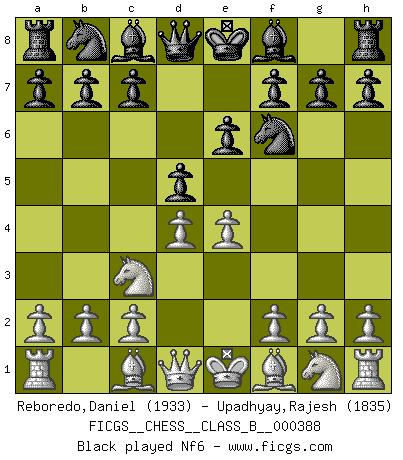 Last move : 1-0 2026 January 1 18:9:49 [Event "FICGS__CHESS__CLASS_B__000388"] [Site "FICGS"] [Date "2025.11.18"] [Round "1"] [White "Reboredo,Daniel"] [Black "Upadhyay,Rajesh"] [Result "1-0"] [WhiteElo "1933"] [BlackElo "1835"] 1.e4 e6 2.d4 d5 3.Nc3 Nf6 4.Bg5 dxe4 5.Nxe4 Nbd7 6.Nf3 Be7 7.Nxf6+ Bxf6 8.Bxf6 Nxf6 9.Bd3 O-O 10.O-O b6 11.Qe2 Bb7 12.Rad1 Qd5 13.c4 Qh5 14.Ne5 Qxe2 15.Bxe2 Rfd8 16.Bf3 Bxf3 17.Nxf3 Rd6 18.Rde1 Rad8 19.b4 Kf8 20.Re3 b5 21.cxb5 Rb6 22.a4 a6 23.Rc1 Nd5 24.Rb3 axb5 25.a5 Ra6 26.Kf1 f6 27.Ne1 Ne7 28.Rxc7 Rxd4 29.Rb7 Rd5 30.Rc3 Rc6 31.Rxc6 Nxc6 32.a6 Rd8 33.Rxb5 Ra8 34.Rb6 Nxb4 35.Rxb4 Rxa6 36.Rb7 h5 37.g3 Kg8 38.Nd3 e5 39.Kg2 Kh7 40.Nc5 Rd6 41.Re7 Kh6 42.Rd7 Rc6 43.Ne4 f5 44.Rd6+ Rxd6 45.Nxd6 Kg5 46.h4+ Kf6 47.f3 g5 48.f4 exf4 49.gxf4 gxh4 50.Kh3 Ke6 51.Ne8 Kd5 52.Nf6+ Kd4 53.Kxh4 Ke3 54.Nxh5 1-0 Follow this game move after move (download)Fischer sacrificed virtually everything most of us weakies (to use his term) value, respect, and cherish, for the sake of an artful, often beautiful board game, for the ambivalent privilege of being its greatest master. (Paul Kollar) Es ist im Leben wie im Schachspiel. Wir entwerfen einen Plan, dieser bleibt jedoch bedingt durch das, was im Schachspiel dem Gegner, im Leben dem Schicksal zu tun belieben wird. (Arthur Schopenhauer) Me dio la sensación de como si yo estuviera jugando en contra del mismo Ajedrez. - al estar jugando en contra de Robert Fischer (Walter Shipman) Avec des compensations pour le matériel en plus... (Anonyme) A bird doesn't sing because it has an answer, it sings because it has a song. (Maya Angelou)