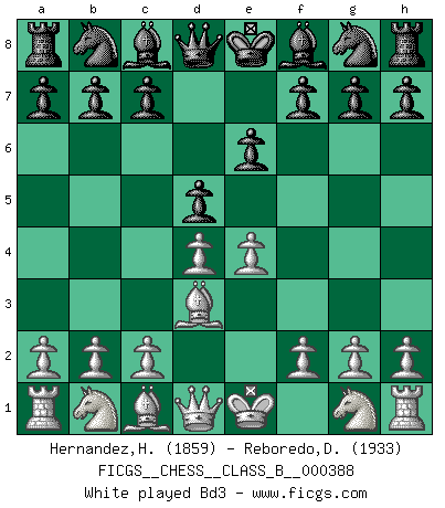 Last move : 1-0 2025 December 28 2:38:30 [Event "FICGS__CHESS__CLASS_B__000388"] [Site "FICGS"] [Date "2025.11.18"] [Round "1"] [White "Hernandez,Humberto"] [Black "Reboredo,Daniel"] [Result "1-0"] [WhiteElo "1859"] [BlackElo "1933"] 1.e4 e6 2.d4 d5 3.Bd3 dxe4 4.Bxe4 Nf6 5.Bf3 c5 6.Ne2 Nc6 7.Be3 e5 8.Bxc6+ bxc6 9.dxe5 Qxd1+ 10.Kxd1 Ng4 11.Nd2 Nxe3+ 12.fxe3 Be7 13.Nf4 O-O 14.Nd3 Bg4+ 15.Ke1 Rad8 16.h3 Bf5 17.Ke2 h6 18.Raf1 Bg6 19.Rf4 Rb8 20.Ra4 Rb7 21.Ne4 Rd8 22.b3 Rd5 23.g4 h5 24.Kf3 Kh7 25.Rc1 Bf8 26.Rc4 Rc7 27.Nexc5 Bxc5 28.Rxc5 Kh6 29.Kf4 hxg4 30.hxg4 Kh7 31.e4 Rd4 32.Nf2 Rd2 33.Ke3 Rd8 34.Nd3 Kg8 35.Rf1 Rb8 36.a4 R8b7 37.Nf4 Rb4 38.Nxg6 fxg6 39.e6 Rb8 40.Kd4 Rd8+ 41.Ke5 Re8 42.g5 1-0 Follow this game move after move (download)A passed Pawn increases in strength as the number of pieces on the board diminishes. (Capablanca) Kasparov ist eine Art Monster mit hundert Augen, denen auch nicht das Geringste entgeht. (Tony Miles) Una buena memoria, concentración, imaginación y una fuerte voluntad, se requiere para llegar a ser un buen jugador. (Bobby Fischer) Aidez vos pièces, elles vous aideront. (Paul Morphy) There are three kinds of lies: lies, damned lies and statistics. (Mark Twain)