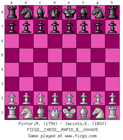 Last move : Qf3 2026 January 7 2:10:43 White clock - 41 days 20:56:26 Black clock - 13 days 15:00:46 [Event "FICGS__CHESS__RAPID_B__000405"] [Site "FICGS"] [Date "2025.11.19"] [Round "1"] [White "Pintor,Manuel"] [Black "Jacinto,Estefanie Grace"] [Result "*"] [WhiteElo "1794"] [BlackElo "1800"] 1.e4 d5 2.exd5 Qxd5 3.Nc3 Qa5 4.d4 Nf6 5.Bd2 Bg4 6.f3 Bd7 7.Bc4 Qb6 8.Nge2 e6 9.O-O Be7 10.Ne4 Bb5 11.Bxb5+ Qxb5 12.b3 Qc6 13.N2g3 Nbd7 14.Nxf6+ Nxf6 15.c4 h5 16.Qe2 h4 17.Ne4 h3 18.Bg5 O-O-O 19.Be3 Nxe4 20.fxe4 Qxe4 21.Rf4 Qg6 22.Rg4 Qh5 23.Qf3 * Follow this game move after move (download)Many have become Chess Masters, no one has become the Master of Chess. (Siegbert Tarrasch) Ohne Leiden bildet sich kein Charakter. (Ernst Freiherr von Feuchtersleben) Cualquier cambio de material en una posición debe venir por medio de un mate, una captura o promoción de Peón. (Purdy) Aux échecs, les retours au sommet sont rares : les dommages psychologiques consécutifs à une défaite sont trop sévères. (Daily Telegraph) Winning isn't everything... but losing is nothing. (Mednis)