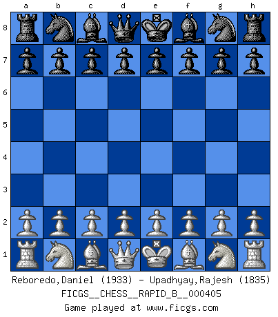 Last move : 1-0 2025 December 13 2:45:38 [Event "FICGS__CHESS__RAPID_B__000405"] [Site "FICGS"] [Date "2025.11.19"] [Round "1"] [White "Reboredo,Daniel"] [Black "Upadhyay,Rajesh"] [Result "1-0"] [WhiteElo "1933"] [BlackElo "1835"] 1.e4 d5 2.exd5 Qxd5 3.Nc3 Qa5 4.d4 Nf6 5.Nf3 Bf5 6.Bc4 e6 7.Bd2 Qb6 8.Qe2 Be7 9.d5 O-O 10.dxe6 Bxe6 11.Bxe6 Qxe6 12.Qxe6 fxe6 13.O-O h6 14.Rfe1 Nbd7 15.Rxe6 Kf7 16.Rae1 Bd6 17.Nb5 Rfe8 18.Nxd6+ cxd6 19.Rxd6 Rxe1+ 20.Bxe1 Re8 21.Kf1 Rc8 22.c3 1-0 Follow this game move after move (download)I look one move ahead... the best ! (Siegbert Tarrasch) Ich möchte Schüler heranbilden, die das Vermögen haben, selbst zu denken und Kritik zu üben. (Emanuel Lasker) Las ideas audaces son como las piezas del Ajedrez que avanzan hacia adelante. Ellas pueden ser vencidas, pero también pueden iniciar una partida victoriosa. (Goethe) Une platitude souvent récitée à propos des Echecs est qu'une des choses les plus difficiles à réaliser est de gagner une position gagnante. Cela ne manque pas de sens mais, pour ma part, j'ai toujours trouvé plus difficile de gagner une position perdante. (Tim Krabbe) If you are going through hell, keep going. (Winston Churchill)