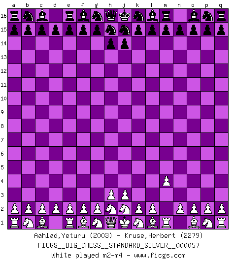 Last move : l14-l11 2025 December 26 1:2:1 Yeturu Aahlad ... is in vacation until 2026 January 21 18:18:4 White clock - 44 days 03:27:26 Black clock - 58 days 05:13:41 [Event "FICGS__BIG_CHESS__STANDARD_SILVER__000057"] [Site "FICGS"] [Date "2025.11.19"] [Round "2"] [White "Aahlad,Yeturu"] [Black "Kruse,Herbert"] [Result "*"] [WhiteElo "2003"] [BlackElo "2279"] 1.m2-m4 j15-k13 2.p1-o3 h16-o10 3.h2-g4 o10-c10 4.j2-k4 c10-c2 5.e2-e4 c2-c7 6.h1-h2 c7-h2 7.k1-h2 b16-c14 8.f1-b5 g16-j15 9.d2-d4 h15-g13 10.l1-p5 k16-h15 11.n2-n3 p16-o14 12.c1-h6 e15-e13 13.b1-d2 f16-c13 14.d2-f3 d15-d14 15.f3-h4 m15-m13 16.a1-c1 l16-o13 17.o1-j6 n15-n14 18.h2-j4 o16-g9 19.g1-f3 c16-k9 20.h4-f5 m16-m14 21.m1-m3 m14-l14 22.m3-l3 l14-l3 23.j4-l3 q16-m16 24.c1-c4 e16-e14 25.e1-c1 e14-f14 26.b5-g10 k9-j8 27.j6-k7 j8-g10 28.k7-g10 m16-m14 29.j1-j2 m14-l14 30.l3-j4 f14-f10 31.g10-l6 f10-b10 32.b2-b3 b10-a10 33.a2-a4 a10-b10 34.c1-c3 l14-l11 35.* Follow this game move after move (download)It was clear to me that the vulnerable point of the American Grandmaster (Bobby Fischer) was in double-edged, hanging, irrational positions, where he often failed to find a win even in a won position. (Efim Geller) Kritik überlasse ich den Spießern. Ich zeige nichts, wofür ich mich schämen muss. (Alexandra Kosteniuk) Alguna parte de un error es siempre correcto. (Savielly Tartakover) Aux échecs, les retours au sommet sont rares : les dommages psychologiques consécutifs à une défaite sont trop sévères. (Daily Telegraph) Memory is a crazy woman that hoards colored rags and throws away food. (Austin O'Malley)