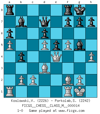 Last move : 1-0 2008 February 12 13:19:9 [Event "FICGS__CHESS__CLASS_M__000014"] [Site "FICGS"] [Date "2007.10.10"] [Round "1"] [White "Koslowski,Volker"] [Black "Porkolab,Sandor"] [Result "1-0"] [WhiteElo "2226"] [BlackElo "2242"] 1.e4 c5 2.Nf3 d6 3.d4 cxd4 4.Nxd4 Nf6 5.Nc3 a6 6.Be3 e6 7.Bd3 Be7 8.O-O Nc6 9.f4 Nxd4 10.Bxd4 e5 11.Bf2 O-O 12.f5 b5 13.Qf3 Bb7 14.Nd5 Nxd5 15.exd5 Bf6 16.a4 b4 17.a5 Qd7 18.Qe4 Bg5 19.h4 1-0 This chess game has been lost on time (started : 2007.10.10 18:21:24) Sicilian : Najdorf, Byrne (English) attack Kingside Castling by player White (move 8) Kingside Castling by player Black (move 11) Player White won this chess game. Follow this game move after move (download)You know, comrade Pachman, I don't enjoy being a Minister, I would rather play Chess like you. (Che Guevara) Warum muß ich gegen diesen IDIOTEN verlieren? (Aaron Nimzowitsch) Dejen al perfeccionista jugar por correo. (Yasser Seirawan) Vous m'avez demandé de vous exposer quel est le fondement de la prière. Je ne fais que préparer les pièces du jeu sur la table... Nous sera-t-il permis d'en adopter les règles et si nous les appliquons scrupuleusement nous ne tarderons pas à faire mat le Roi divin ! Il ne pourra échapper à nos mains. (Sainte Thérèse d'Avila, Chemin de perfection) To steal ideas from one person is plagiarism. To steal from many is research. (Unknown)