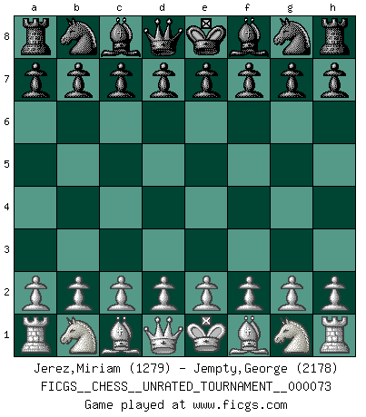 Last move : O-O 2026 January 9 13:39:54 White clock - 57 days 00:36:39 Black clock - 60 days 10:16:10 [Event "FICGS__CHESS__UNRATED_TOURNAMENT__000073"] [Site "FICGS"] [Date "2025.11.23"] [Round "1"] [White "Jerez,Miriam"] [Black "Jempty,George"] [Result "*"] [WhiteElo "1279"] [BlackElo "2178"] 1.d4 d5 2.Nf3 Nd7 3.e4 dxe4 4.Nfd2 f5 5.Na3 e5 6.dxe5 Nxe5 7.b3 Qd4 8.Rb1 Bc5 9.Bb5+ c6 10.O-O cxb5 11.Nxb5 Qd7 12.c4 Nd3 13.Nxe4 fxe4 14.Nc3 Nf6 15.h3 O-O 16.* Comment by player 2 : George Jempty : On move 4 White foolishly opts avoiding the"Gibaud" gambit reversed LOL which begins 4. Ng5 Follow this game move after move (download)Chess holds its master in its own bonds, shackling the mind and brain so that the inner freedom of the very strongest must suffer. (Albert Einstein) Kleine Schachspieler machen Mist, und große Schachspieler machen Mist, aber große machen weniger Mist. (Fritz Sämisch) El Ajedrez es 99 por ciento táctica. (Teichmann) Les pièces de l'échiquier étaient impitoyables. Elles le retenaient, elles l'absorbaient. Il y avait de l'horreur en cela, mais aussi une harmonie unique. Car, qu'y a-t-il dans le monde, à part les échecs ? (V. Nabokov) Secret operations are essential in war; upon them the army relies to make its every move. (Sun Tzu)