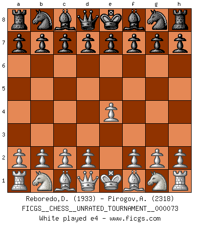 Last move : Rb8 2026 January 8 14:35:59 White clock - 73 days 20:47:03 (59 days 18:54:45) Black clock - 63 days 11:26:22 [Event "FICGS__CHESS__UNRATED_TOURNAMENT__000073"] [Site "FICGS"] [Date "2025.11.23"] [Round "1"] [White "Reboredo,Daniel"] [Black "Pirogov,Andrey Mikhaylovich"] [Result "*"] [WhiteElo "1933"] [BlackElo "2318"] 1.e4 e5 2.Nf3 Nc6 3.Bb5 a6 4.Ba4 Nf6 5.O-O Be7 6.Re1 b5 7.Bb3 d6 8.c3 O-O 9.a4 Bg4 10.h3 Bxf3 11.Qxf3 Na5 12.Bc2 c5 13.d3 b4 14.Nd2 Rb8 15.* Follow this game move after move (download)One doesn't have to play well, it's enough to play better than your opponent. (Siegbert Tarrasch) Den Ruhm habe ich schon, jetzt brauche ich noch das Geld. (Wilhelm Steinitz) El Ajedrez es el gimnasio de la mente. (Blaise Pascal) On peut tirer plus d'utilité d'une partie perdue que de 100 parties gagnées. (Capablanca) The real danger is not that computers will begin to think like men, but that men will begin to think like computers. (Sydney J. Harris)