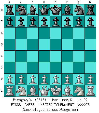 Last move : 1-0 2026 January 7 1:30:49 [Event "FICGS__CHESS__UNRATED_TOURNAMENT__000073"] [Site "FICGS"] [Date "2025.11.23"] [Round "1"] [White "Pirogov,Andrey Mikhaylovich"] [Black "Martinez,Silvio"] [Result "1-0"] [WhiteElo "2318"] [BlackElo "1412"] 1.e4 Nf6 2.e5 Nd5 3.c4 Nf4 4.d4 g5 5.h4 Ne6 6.d5 Nc5 7.Be3 Ne4 8.Bd3 f5 9.Qh5+ 1-0 Follow this game move after move (download)A bad plan is better than none at all. (Frank Marshall) Was ist der Unterschied zwischen einem Strassenarbeiter und einem Schachspieler? --Der Schachspieler bewegt sich ab und zu. (Anonymous) El Ajedrez por encima de todo... ¡es una pelea!. (Emanuel Lasker) Un journaliste : 'Vous préférez avoir une dame de plus sur l'échiquier ou au lit ?' Boris Spassky : 'Ca dépend de la position.' Warrior pose battles inner weakness and wins focus. You see that there is no war within you. You're on your own side, and you are your own strength. (Terri Guillemets)