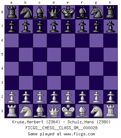 Last move : 1-0 2026 January 5 12:48:55 [Event "FICGS__CHESS__CLASS_SM__000028"] [Site "FICGS"] [Date "2025.11.24"] [Round "1"] [White "Kruse,Herbert"] [Black "Schulz,Hans"] [Result "1-0"] [WhiteElo "2364"] [BlackElo "2380"] 1.e4 1-0 This chess game has been lost on time (started : 2025.11.24 22:9:2) Follow this game move after move (download)It is always better to sacrifice your opponent's men. (Savielly Tartakower) Man kann eine Schachpartie nur gewinnen, wenn das Gleichgewicht gestört ist. In einer Stellung mit ungestörtem Gleichgewicht ist auch das größte Genie hilflos - in der Stellung steckt dann eben kein genialer Einfall. (Wilhelm Steinitz) Nunca antes ha habido un jugador de Ajedrez con tal conocimiento a fondo de las complejidades del juego y una inmensa voluntad absolutamente indomable de ganar. Yo pienso que Fischer es el jugador mas grande que jamás haya existido. (Lisa Lane) Les Cavaliers se révèlent fort utiles dans les positions fermées. D'habitude, les Fous sont un peu plus forts que les Cavaliers dans les positions ouvertes. Qu'on le veuille ou non, il restera toujours des exceptions ! The only thing that overcomes hard luck is hard work. (Harry Golden)