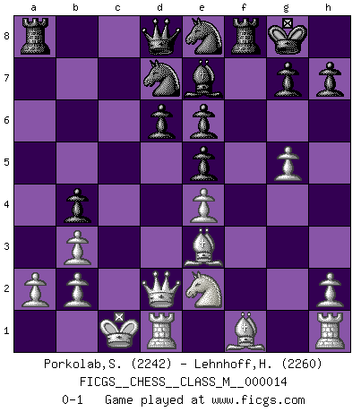 Last move : 0-1 2008 January 17 23:27:2 [Event "FICGS__CHESS__CLASS_M__000014"] [Site "FICGS"] [Date "2007.10.10"] [Round "1"] [White "Porkolab,Sandor"] [Black "Lehnhoff,Heinz-Georg"] [Result "0-1"] [WhiteElo "2242"] [BlackElo "2260"] 1.e4 c5 2.Nf3 d6 3.d4 cxd4 4.Nxd4 Nf6 5.Nc3 a6 6.f3 e5 7.Nb3 Be6 8.Be3 Nbd7 9.Qd2 Be7 10.g4 O-O 11.O-O-O b5 12.g5 b4 13.Ne2 Ne8 14.f4 a5 15.f5 a4 16.fxe6 axb3 17.cxb3 fxe6 0-1 This chess game has been lost on time (started : 2007.10.10 18:21:24) Sicilian : Najdorf Kingside Castling by player Black (move 10) Queenside Castling by player White (move 11) Player Black won this chess game. Follow this game move after move (download)A Chess game is divided into three stages: the first, when you hope you have the advantage, the second when you believe you have an advantage, and the third... when you know you're going to lose ! (Savielly Tartakower) Im Schach gewinnt jeder. Hat man Freunde am Spiel - und das ist die Hauptsache - ist auch der Verlust einer Partie kein Unglück. (David Bronstein) El jugador de combinación piensa hacia adelante; comienza de la posición dada y trabaja las movidas contundentes en su mente. (Emanuel Lasker) La guerre est enfant de la passion, la passion est enfant du narcissisme et le narcissisme est l'enfant. (...) Une autre partie ? (Thibault de Vassal) There's no money in correspondence chess. (John Knudsen)