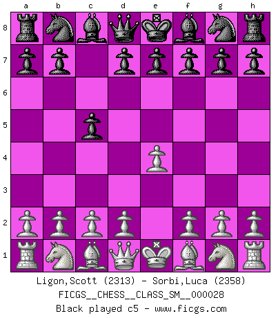 Last move : 1/2-1/2 2025 December 4 18:45:21 [Event "FICGS__CHESS__CLASS_SM__000028"] [Site "FICGS"] [Date "2025.11.24"] [Round "1"] [White "Ligon,Scott"] [Black "Sorbi,Luca"] [Result "1/2-1/2"] [WhiteElo "2313"] [BlackElo "2358"] 1.e4 c5 2.Nf3 d6 3.d4 cxd4 4.Nxd4 Nf6 5.Nc3 a6 6.Be3 e5 7.Nb3 Be7 8.f3 Be6 9.Qd2 h5 10.Nd5 Nxd5 11.exd5 Bf5 12.Be2 a5 13.a4 Nd7 14.O-O O-O 15.f4 exf4 16.Bxf4 Rc8 17.c3 Nf6 18.Nd4 Bg6 19.Bf3 Ne4 20.Bxe4 Bxe4 21.Rae1 Bxd5 22.Rxe7 Qxe7 23.Nf5 Qd7 24.Nxg7 Qg4 25.Qxd5 Qxg7 26.Qxh5 Rfe8 27.Qb5 Re6 28.h3 Rc5 29.Qxb7 Rf5 30.Rf2 Qf6 31.Qa8+ Kh7 32.Qf3 Qg6 33.Kh2 Re1 34.b4 Rf6 35.b5 Re4 36.g3 Rxa4 37.Qd1 Rc4 38.b6 Rxc3 39.b7 Rxf4 40.gxf4 Qg3+ 41.Kh1 Qxf2 42.Qh5+ Kg7 43.Qg5+ Kh7 44.Qh5+ Kg7 45.Qg5+ Kh7 46.Qh5+ 1/2-1/2 Follow this game move after move (download)Bobby is the finest Chess player this country ever produced. His memory for the moves, his brilliance in dreaming up combinations, and his fierce determination to win are uncanny. (John Collins) Die Fehler sind da, Sie warten nur darauf gemacht zu werden. (Savielly Grigorievitsch Tartakower) No puedes jugar al Ajedrez si eres de corazón noble. (Proverbio Francés) Je ne suis pas le dernier à jouer lâchement des coups douteux pendant le zeïtnot de l'adversaire pour l'achever: en effet les coups qui font le plus peur sont ceux que l'on ne comprend pas. Je me fais souvent peur quand je joue. (Un professeur anonyme) Life is like a ten-speed bicycle: most of us have gears we never use. (Charles M. Schulz)