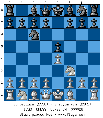 Last move : 1/2-1/2 2025 December 28 6:48:11 [Event "FICGS__CHESS__CLASS_SM__000028"] [Site "FICGS"] [Date "2025.11.24"] [Round "1"] [White "Sorbi,Luca"] [Black "Gray,Garvin"] [Result "1/2-1/2"] [WhiteElo "2358"] [BlackElo "2302"] 1.e4 e5 2.Nf3 Nc6 3.Bb5 a6 4.Ba4 Nf6 5.O-O Be7 6.Re1 b5 7.Bb3 O-O 8.a4 b4 9.d4 d6 10.dxe5 Nxe5 11.Nxe5 dxe5 12.Qe2 Bc5 13.Nd2 Qe7 14.h3 a5 15.Nc4 Be6 16.Be3 Nxe4 17.Bxc5 Nxc5 18.Qxe5 Rfd8 19.Rad1 Rxd1 20.Rxd1 h6 21.Rd5 Nxb3 1/2-1/2 Follow this game move after move (download)I am still a victim of Chess. It has all the beauty of art and much more. It cannot be commercialized. Chess is much purer than art in its social position. (Marcel Duchamp) Ich habe kein Problem mit Frauen, sondern nur mit dem Niveau ihres Schachspiels (Judith Polgar) El juego de Fischer siempre fue nítido, racional y brillante. Uno de los mejores por siempre. (Dave Regis) Fischer est le meilleur joueur du monde et Karpov n'est qu'un joueur de bistrot. (Garry Kasparov, agé de 16 ans) The Internet isn't free. It just has an economy that makes no sense to capitalism. (Brad Shapcott)