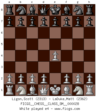 Last move : 1-0 2026 January 9 4:33:18 [Event "FICGS__CHESS__CLASS_SM__000028"] [Site "FICGS"] [Date "2025.11.24"] [Round "1"] [White "Ligon,Scott"] [Black "LaDuke,Matt"] [Result "1-0"] [WhiteElo "2313"] [BlackElo "2362"] 1.e4 e5 2.Nf3 Nc6 3.Bb5 Nf6 4.O-O Nxe4 5.Re1 Nd6 6.Nxe5 Be7 7.Bf1 Nxe5 8.Rxe5 O-O 9.Nc3 Ne8 10.Nd5 Bd6 11.Re1 c6 12.Ne3 Be7 13.c4 Nc7 14.d4 d5 15.cxd5 Bb4 16.Bd2 Bxd2 17.Qxd2 Nxd5 18.Nxd5 Qxd5 19.Re5 Qd6 20.Bc4 h6 21.Rae1 Bd7 22.a3 Rad8 23.Qc3 b6 24.h3 Rfe8 25.Qf3 Qf8 26.b4 Rxe5 27.dxe5 Rc8 28.Ba6 Re8 29.Rd1 Bc8 30.Bxc8 Rxc8 31.Rd7 c5 32.bxc5 Qxc5 33.Qxf7+ 1-0 Follow this game move after move (download)The most powerful weapon in Chess is to have the next move. (David Bronstein) Wie, soll nun auch die Opposition abgeschafft werden? Ja, es tut mir leid, Ihnen diesen Schmerz nicht ersparen zu können. (Aaron Nimzowitsch) No hay precio que sea tan grande por la cabellera del Rey enemigo. (Koblentz) Le moment que je préfère le plus dans une rencontre, c'est celui où je sens que la personnalité de l'adversaire se brise. (Robert Fischer) The only difference between a tax man and a taxidermist is that the taxidermist leaves the skin. (Mark Twain)