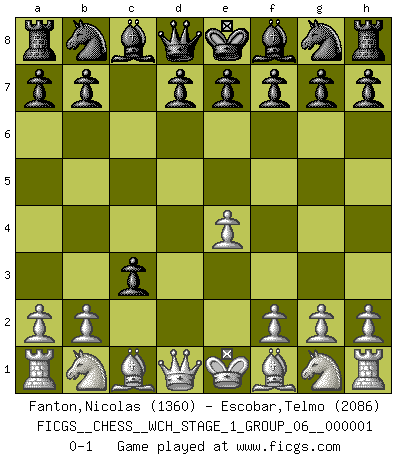 Last move : 0-1 2006 August 11 17:21:28 [Event "FICGS__CHESS__WCH_STAGE_1_GROUP_06__000001"] [Site "FICGS"] [Date "2006.07.01"] [Round "1"] [White "Fanton,Nicolas"] [Black "Escobar,Telmo"] [Result "0-1"] [WhiteElo "1360"] [BlackElo "2086"] 1.e4 c5 2.d4 cxd4 3.c3 dxc3 0-1 This chess game has been lost on time (started : 2006.07.01 16:7:34) Sicilian : Smith-Morra gambit Player Black won this chess game. Follow this game move after move (download)Alekhine is a poet who creates a work of art out of something that would hardly inspire another man to send home a picture post card. (Max Euwe) Rauchen ist dem Schachspieler bei seiner Arbeit, also im Wettkampf, untersagt. (Viktor Kortschnoi) Fischer es una tragedia del Ajedrez Americano a la par con Morphy y Pillsbury. (Mig Greengard) La tactique est l'élément le plus important du milieu de jeu. (Siegbert Tarrasch) Ah, beer! The cause of, and the solution to, all of life's problems. (Homer Simpson)