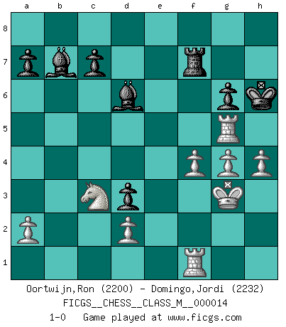Last move : 1-0 2008 April 18 23:17:49 [Event "FICGS__CHESS__CLASS_M__000014"] [Site "FICGS"] [Date "2007.10.10"] [Round "1"] [White "Oortwijn,Ron"] [Black "Domingo,Jordi"] [Result "1-0"] [WhiteElo "2200"] [BlackElo "2232"] 1.e4 e5 2.Nf3 f5 3.Bc4 fxe4 4.Nxe5 d5 5.Qh5+ g6 6.Nxg6 hxg6 7.Qxh8 Kf7 8.Qd4 Be6 9.Be2 Nc6 10.Qe3 Bh6 11.f4 d4 12.Qf2 Nf6 13.O-O d3 14.cxd3 exd3 15.Bd1 Nd4 16.Nc3 Bf8 17.Kh1 b5 18.b3 Bc5 19.Bf3 Nxb3 20.Qh4 Nd4 21.Bb2 Nxf3 22.Rxf3 Bf5 23.Re1 Qh8 24.Qxh8 Rxh8 25.Nxb5 Rb8 26.Bxf6 Kxf6 27.Nc3 Kg7 28.h3 Rd8 29.Kh2 Rd4 30.g4 Bc8 31.Kg3 Bb7 32.Rfe3 Rd7 33.Re5 Bd6 34.Rg5 Rf7 35.Rf1 Kh6 36.h4 1-0 Latvian : Polerio variation Kingside Castling by player White (move 13) Player White won this chess game. Follow this game move after move (download)Personally, I rather look forward to a computer program winning the world Chess Championship. Humanity needs a lesson in humility. (Richard Dawkings) Im Internet Chess Club betrug mein Rating vorübergehend 3350 ELO-Punkte. (Sergej Karjakin) El Peón aislado arroja penumbra sobre todo el tablero. (Aaron Nimzovich) Lorsque vous vous retrouvez devant une position atroce, ne tendez pas un ultime piège dérisoire avec l'intention d'abandonner si l'adversaire le déjoue ! Faites-vous plutôt un devoir de résister comme si votre vie en dépendait. Jouez le coup qui vous déplairait au centuple si vous étiez dans la peau de votre tortionnaire ! Everything in life is luck. (Donald Trump)