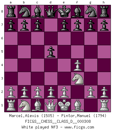 Last move : 0-1 2025 December 22 5:57:40 [Event "FICGS__CHESS__CLASS_D__000308"] [Site "FICGS"] [Date "2025.11.27"] [Round "1"] [White "Marcel,Alexis"] [Black "Pintor,Manuel"] [Result "0-1"] [WhiteElo "1505"] [BlackElo "1794"] 1.f4 d5 2.Nf3 Nc6 3.e3 Bg4 4.Bb5 e6 5.O-O Bc5 6.b3 Qf6 7.Nc3 Nge7 8.Bb2 Qg6 9.Bd3 Qh5 10.Ne2 Bxf3 11.Rxf3 f5 12.Rh3 Qf7 13.Ng3 O-O-O 14.a4 a5 15.Nh5 Rhg8 16.Ng3 Ng6 17.Rxh7 Nxf4 18.Nh5 Nxd3 19.cxd3 f4 20.Nxf4 Qxf4 21.d4 Qe4 22.Rh3 g5 23.dxc5 Rdf8 24.Rg3 Rf5 25.Rc1 e5 26.d3 Qb4 27.Bc3 Qxc5 28.Bxe5 Qe7 29.Bb2 Ne5 30.Bxe5 Rxe5 31.Qg4+ Kb8 32.d4 Rxe3 33.Rxe3 Qxe3+ 0-1 Follow this game move after move (download)Chess is above all, a fight ! (Emanuel Lasker) Ich erzeugte keinen Neid, da mich die Schachspieler als Musiker und die Musiker als Schachspieler betrachteten. (Mark Taimanov) Yo tuve un dolor de muelas en la primer partida. En el segundo juego, tuve un dolor de cabeza. En el tercero, tuve un ataque de reumatísmo. En la cuarta partida, no me sentía muy bien. ¿Y en el quinto juego? Bueno, ¿que acaso uno tiene que ganar todos los juegos?. (Siegbert Tarrasch) Toutes choses étant égales, c'est la conviction qui gagne. Alliée à une volonté de vaincre, elle sert de détonateur, suscite des idées, disperse les doutes et aide à penser clairement. (Robert Fischer) In my experience, there's no such thing as luck. (Obi-Wan Kenobi in Star Wars ep.4)