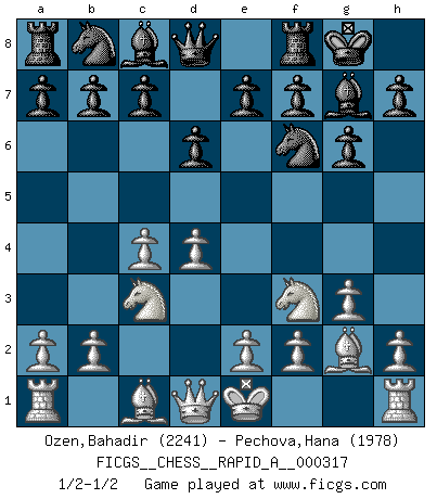 Last move : 1/2-1/2 2026 January 15 10:10:32 [Event "FICGS__CHESS__RAPID_A__000317"] [Site "FICGS"] [Date "2025.11.29"] [Round "1"] [White "Ozen,Bahadir"] [Black "Pechova,Hana"] [Result "1/2-1/2"] [WhiteElo "2241"] [BlackElo "1978"] 1.d4 Nf6 2.c4 g6 3.g3 Bg7 4.Bg2 O-O 5.Nf3 d6 6.Nc3 Bf5 7.Nh4 Bc8 8.Nf3 Bf5 9.Nh4 Bc8 10.Nf3 1/2-1/2 Follow this game move after move (download)There are two types of sacrifices: correct ones and mine. (Mikhail Tal) Schach verlangt totale Konzentration. (Robert James Fischer) Ayuda a tus piezas para que ellas te puedan ayudar. (Paul Morphy) Le jeu d'échecs fait naître et fortifie en nous plusieurs qualités précieuses dans le cours de l'existence, telles que la prévoyance, la circonspection, la prudence, et la persévérance. (Benjamin Franklin - 1783, la morale des échecs) Life is the sum of all your choices. (Albert Camus)