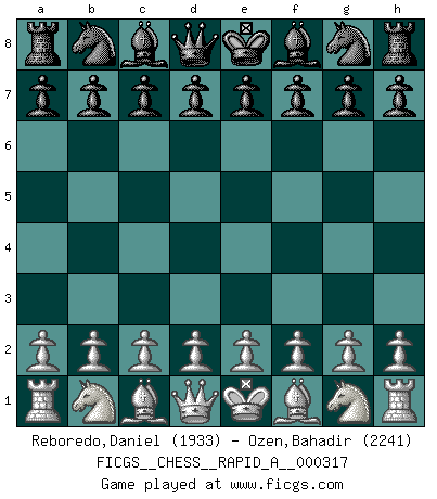 Last move : 1/2-1/2 2026 January 3 19:14:38 [Event "FICGS__CHESS__RAPID_A__000317"] [Site "FICGS"] [Date "2025.11.29"] [Round "1"] [White "Reboredo,Daniel"] [Black "Ozen,Bahadir"] [Result "1/2-1/2"] [WhiteElo "1933"] [BlackElo "2241"] 1.e4 c5 2.c3 Nf6 3.e5 Nd5 4.d4 cxd4 5.Nf3 Nc6 6.Bc4 Nb6 7.Bb3 d5 8.exd6 Qxd6 9.O-O Be6 10.Bxe6 Qxe6 11.Nxd4 Nxd4 12.cxd4 Qd7 13.Nc3 g6 14.Re1 Bg7 15.Bg5 e6 16.Qf3 O-O 17.Bf6 Bxf6 18.Qxf6 Rfd8 19.Rad1 Qc7 20.Rd3 Nd5 21.Qf3 Rd7 22.Nxd5 Rxd5 23.Rc3 Qb6 24.Rb3 Qa5 25.Qc3 b6 26.Ra3 Qb5 27.Re5 Rxe5 28.dxe5 Rd8 29.h3 Qe2 30.Qe3 Qxe3 1/2-1/2 Follow this game move after move (download)Chess is mental torture. (Garry Kasparov) Das Schachspiel ist ein See, in welchem eine Mücke baden und ein Elefant ertrinken kann. (Emanuel Lasker) Solo los afeminados hacen el Enroque. (Rob Sillars) Demandez au pauvre Cg1 ce qu'il en pense. Eduard Gufeld à propos de la variante Saemisch de l'Est-Indienne. You cannot beat a roulette table unless you steal money from it. (Albert Einstein)