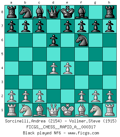 Last move : Bxd7 2025 December 14 11:44:57 White clock - 43 days 16:11:53 Black clock - 18 days 06:20:48 [Event "FICGS__CHESS__RAPID_A__000317"] [Site "FICGS"] [Date "2025.11.29"] [Round "1"] [White "Sorcinelli,Andrea"] [Black "Vollmer,Steve"] [Result "*"] [WhiteElo "2154"] [BlackElo "1915"] 1.e4 d6 2.d4 Nf6 3.Nc3 g6 4.Be3 Bg7 5.Qd2 O-O 6.Bh6 c6 7.h4 b5 8.Bxg7 Kxg7 9.h5 Rh8 10.h6+ Kf8 11.a3 a5 12.Nf3 Bb7 13.Bd3 Nbd7 14.e5 dxe5 15.dxe5 Nd5 16.Nxd5 cxd5 17.Bxb5 Rc8 18.Qf4 e6 19.Ng5 Qe7 20.Bxd7 * Follow this game move after move (download)Fischer is completely natural. He plays no roles. He's like a child. Very, very simple. (Zita Rajcsanyi) Heutzutage gewinnt im Turnier nicht derjenige Spieler, der weitreichende Pläne entwirft, sondern einfach jener, der Zug um Zug kämpft. (David Bronstein) Fischer es el jugador mas fuerte del mundo. De hecho, el jugador mas fuerte que jamas haya existido. (Larry Evans) J'ai toujours senti une vague pitié pour l'homme qui ne connaît rien aux échecs, tout comme j'en aurais pour un homme ignorant de l'amour. Les Echecs, comme la musique ou comme l'amour, ont le pouvoir de rendre heureux. (Siegbert Tarrasch) As a goal marker shodan is important. As a destination it is a poor place to stop. (Thomas Tamayo)