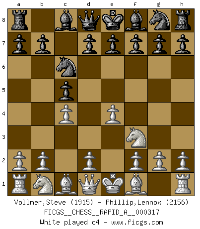 Last move : 0-1 2025 December 14 11:40:18 [Event "FICGS__CHESS__RAPID_A__000317"] [Site "FICGS"] [Date "2025.11.29"] [Round "1"] [White "Vollmer,Steve"] [Black "Phillip,Lennox"] [Result "0-1"] [WhiteElo "1915"] [BlackElo "2156"] 1.e4 c5 2.Nf3 Nc6 3.c4 e5 4.Nc3 g6 5.Be2 d6 6.O-O Bg7 7.d3 Nge7 8.h3 a5 9.Nh2 O-O 10.f4 f5 11.g4 Nd4 12.Be3 a4 13.Bxd4 cxd4 14.Nd5 Nxd5 15.cxd5 fxe4 16.fxe5 Bxe5 17.dxe4 Rxf1+ 18.Qxf1 d3 19.Bxd3 Qb6+ 20.Kh1 Qxb2 0-1 Follow this game move after move (download)The boy (then a 12 year old boy named Anatoly Karpov) doesn't have a clue about Chess, and there's no future at all for him in this profession. (Mikhail Botvinnik) Frage des Reporters: -Worin besteht das Ziel von Gambiteröffnungen? Antwort: -Auf Kosten der Partie einen Ruf als Angriffspieler zu erwerben.- (Siegbert Tarrasch) Los errores estan ahí, esperando a que se cometan. (Savielly Tartakower) Toutes choses étant égales, c'est la conviction qui gagne. Alliée à une volonté de vaincre, elle sert de détonateur, suscite des idées, disperse les doutes et aide à penser clairement. (Robert Fischer) The Internet is so big, so powerful and pointless that for some people it is a complete substitute for life. (Andrew Brown)