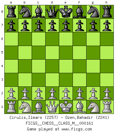 Last move : 1/2-1/2 2025 December 23 20:55:43 [Event "FICGS__CHESS__CLASS_M__000161"] [Site "FICGS"] [Date "2025.12.02"] [Round "1"] [White "Cirulis,Ilmars"] [Black "Ozen,Bahadir"] [Result "1/2-1/2"] [WhiteElo "2257"] [BlackElo "2241"] 1.d4 Nf6 2.b3 d5 3.Nf3 c5 4.dxc5 e6 5.Nbd2 Bxc5 6.Bb2 O-O 7.e3 b6 8.c4 Bb7 9.a3 Nbd7 10.Be2 dxc4 11.Nxc4 b5 12.Nd6 Bxd6 13.Qxd6 Ne4 14.Qd4 f6 15.O-O Ndc5 16.b4 Nb3 17.Qxd8 Rfxd8 18.Rad1 a6 19.Rxd8+ Rxd8 20.Rd1 1/2-1/2 Follow this game move after move (download)When I asked Fischer why he had not played a certain move in our game, he replied: 'Well, you laughed when I wrote it down !' (Mikhail Tal) Ich glaube nicht an Psychologie, ich glaube an gute Züge. (Robert James Fischer) Los tropiezos estan todos ahí en el tablero, esperando que se cometan. (Savielly Tartakover) La menace est plus forte que l'exécution. (Aaron Nimzovitch) Those parts of the system that you can hit with a hammer (not advised) are called hardware; those program instructions that you can only curse at are called software. (Anonymous)