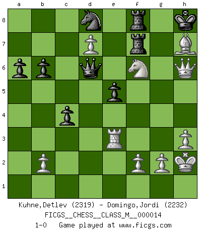 Last move : 1-0 2008 June 12 11:32:50 [Event "FICGS__CHESS__CLASS_M__000014"] [Site "FICGS"] [Date "2007.10.10"] [Round "1"] [White "Kuhne,Detlev"] [Black "Domingo,Jordi"] [Result "1-0"] [WhiteElo "2319"] [BlackElo "2232"] 1.c4 e6 2.Nf3 d5 3.d4 dxc4 4.e3 Nf6 5.Bxc4 c5 6.O-O a6 7.a4 Nc6 8.Qe2 Qc7 9.Nc3 Bd6 10.Rd1 O-O 11.Bd2 b6 12.d5 Na5 13.Ba2 c4 14.e4 e5 15.Bg5 Bd7 16.Bxf6 gxf6 17.Nh4 Kh8 18.Qf3 Qd8 19.Nf5 Bxf5 20.exf5 Bc5 21.Qh5 Bd4 22.Rd2 Rg8 23.Qxf7 Rf8 24.Qh5 Qd7 25.Re1 Rac8 26.Qh4 Qxf5 27.Ne2 Bc5 28.Bb1 Qd7 29.d6 Rf7 30.Ng3 Rcf8 31.Bf5 Qxa4 32.d7 Nb7 33.Ne4 Qb4 34.Qh6 Nd8 35.Nxf6 Be3 36.Rxe3 Qxd2 37.h3 Qd1+ 38.Kh2 Qd6 39.Bxh7 1-0 English Opening : Agincourt variation Kingside Castling by player White (move 6) Kingside Castling by player Black (move 10) Player White won this chess game. Follow this game move after move (download)One of these modest little moves may be more embarrassing to your opponent than the biggest threat. (Siegbert Tarrasch) Ein guter Spieler hat immer Glück. (José Raúl Capablanca) La táctica fluye a partir de una posición superior. (Bobby Fischer) Je crois qu'il existe des manières très spécifiques de jouer efficacement contre une machine. Evidemment, nous n'avons aucune chance en technique pure, parce que l'ordinateur calcule de manière parfaite. Mais lorsque nous faisons appel à notre cerveau, en utilisant l'intuition et la compréhension, alors nous restons beaucoup plus forts. (Anatoli Karpov) All the biggest technological inventions created by man - the airplane, the automobile, the computer - says little about his intelligence, but speaks volumes about his laziness. (Mark Kennedy)