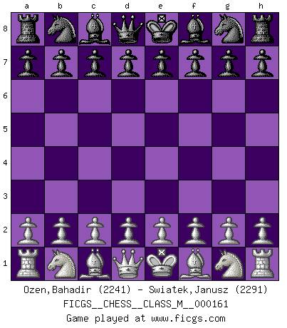 Last move : 1/2-1/2 2026 January 11 21:39:50 [Event "FICGS__CHESS__CLASS_M__000161"] [Site "FICGS"] [Date "2025.12.02"] [Round "1"] [White "Ozen,Bahadir"] [Black "Swiatek,Janusz"] [Result "1/2-1/2"] [WhiteElo "2241"] [BlackElo "2291"] 1.Nf3 d5 2.e3 Nf6 3.c4 e6 4.Nc3 dxc4 5.Bxc4 a6 6.a4 c5 7.O-O Nc6 8.d4 Be7 9.Qe2 cxd4 10.Rd1 e5 11.exd4 exd4 12.Nxd4 Nxd4 13.Qe5 Qd6 14.Qxd6 Bxd6 15.Rxd4 Be5 16.Rd1 O-O 17.Be3 Bg4 18.f3 Be6 19.Bxe6 fxe6 20.Ra3 1/2-1/2 Follow this game move after move (download)Chess is ruthless: you've got to be prepared to kill people. (Nigel Short) Es genügt nicht ein guter Spieler zu sein, man muß auch gut spielen. (Siegbert Tarrasch) Buenas posiciones no logran ganar juegos, buenas movidas sí. (Gerald Abrahams) Même si vous avez un bon coup à faire, regardez toujours s'il n'y en a pas un qui lui soit préférable. (Pedro Damiano) History is the quarrels of popes and kings, with wars or pestilences in every page; the men all so good for nothing, and hardly any women at all. (Jane Austen)