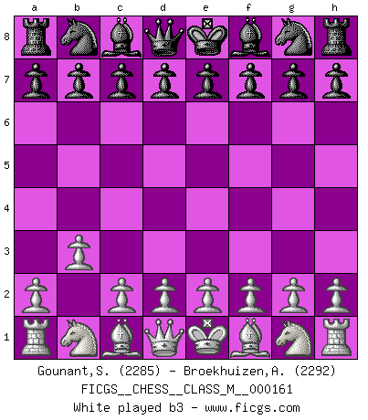 Last move : Nd2 2026 January 12 15:49:45 White clock - 77 days 00:53:29 Black clock - 38 days 06:21:18 [Event "FICGS__CHESS__CLASS_M__000161"] [Site "FICGS"] [Date "2025.12.02"] [Round "1"] [White "Gounant,Stanislas"] [Black "Broekhuizen,A. T. S."] [Result "*"] [WhiteElo "2285"] [BlackElo "2292"] 1.b3 e5 2.Bb2 Nc6 3.e3 Nf6 4.Bb5 Qe7 5.Ne2 a6 6.Bxc6 dxc6 7.d3 Bd7 8.e4 O-O-O 9.Qc1 h5 10.Qe3 b6 11.h3 h4 12.Nd2 * Follow this game move after move (download)Bobby is the most misunderstood, misquoted celebrity walking the face of this earth. (Yasser Seirawan) Wenn es im Universum noch irgendwo intelligente Lebewesen gibt, dann kennen sie Go. (Emanuel Lasker) El muchacho (en ese entonces un niño de 12 años llamado Anatoly Karpov) no tiene ni idea de lo que es el Ajedrez y no hay futuro en absoluto para el en esta profesión. (Mikhail Botvinnik) Les réformistes prétendent que les progrès de la théorie conduiront à la disparition des échecs, et qu'il faut, pour leur rendre vie, en remanier les règles. En réalité, qu'exprime cette affirmation? Le mépris de l'intuition, de l'imagination et de tous les autres éléments qui font des échecs un art. (Alexander Alekhine) I find television to be very educating. Every time somebody turns on the set, I go in the other room and read a book. (Groucho Marx)