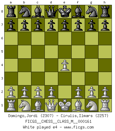 Last move : 1/2-1/2 2025 December 21 23:22:48 [Event "FICGS__CHESS__CLASS_M__000161"] [Site "FICGS"] [Date "2025.12.02"] [Round "1"] [White "Domingo,Jordi"] [Black "Cirulis,Ilmars"] [Result "1/2-1/2"] [WhiteElo "2307"] [BlackElo "2257"] 1.e4 c6 2.d4 d5 3.e5 Bf5 4.Nc3 e6 5.g4 Bg6 6.Nge2 c5 7.h4 h5 8.Nf4 Bh7 9.Nxh5 Nc6 10.dxc5 Bxc5 11.Bg5 Qb6 12.Qd2 Nd4 13.O-O-O Bxc2 14.Nxg7+ Kf8 15.Nh5 Rc8 16.Nf6 Rc7 17.Rh3 Nxf6 18.Bxf6 Ba3 19.Bb5 Bxb2+ 20.Kxb2 Nxb5 21.Nxb5 Qxb5+ 22.Rb3 Bxb3 23.axb3 Rh7 24.h5 Ke8 25.h6 a5 26.Rc1 Rxc1 27.Qxc1 Kd7 28.g5 a4 29.Qc2 Qxb3+ 1/2-1/2 Follow this game move after move (download)Examine moves that smite! A good eye for smites is far more important than a knowledge of strategical principles. (Purdy) Ich bin es gewohnt, das die Jugend mir überhaupt keinen Respekt entgegenbringt. (Alexander Morozewich) Una compensación adecuada por un sacrificio es tener una combinación sólida que conduce a una posición ganadora; una compensación adecuada por una metida de pata es dejar a tu oponente arrebatar una derrota de las fauces de la victoria. (Bruce A. Moon) J'ai toujours senti une vague pitié pour l'homme qui ne connaît rien aux échecs, tout comme j'en aurais pour un homme ignorant de l'amour. Les Echecs, comme la musique ou comme l'amour, ont le pouvoir de rendre heureux. (Siegbert Tarrasch) Memory is a crazy woman that hoards colored rags and throws away food. (Austin O'Malley)