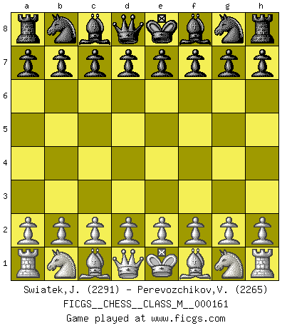 Last move : Rfa1 2026 January 16 19:23:47 White clock - 94 days 02:29:27 Black clock - 62 days 09:55:49 (59 days 12:11:17) [Event "FICGS__CHESS__CLASS_M__000161"] [Site "FICGS"] [Date "2025.12.02"] [Round "1"] [White "Swiatek,Janusz"] [Black "Perevozchikov,Vjacheslav"] [Result "*"] [WhiteElo "2291"] [BlackElo "2265"] 1.e4 e6 2.d4 d5 3.Nc3 Bb4 4.e5 c5 5.a3 Ba5 6.Qg4 Ne7 7.dxc5 O-O 8.Bd3 Nd7 9.Nf3 Bxc3+ 10.bxc3 Nf5 11.a4 Nxc5 12.Ba3 b6 13.O-O Re8 14.Qh5 g6 15.Qg4 Bb7 16.Qf4 Rc8 17.Bxc5 Rxc5 18.a5 bxa5 19.Ra3 Qe7 20.Rfa1 * Follow this game move after move (download)During a Chess competition a Chessmaster should be a combination of a beast of prey and a monk. (Alexander Alekhine) Ich hatte meine größten Erfolge, als ich 47 Jahre alt war. Kasparow war noch nicht mal 42 und hat das Schach schon im Stich gelassen. (Viktor Kortschnoi) No es tiempo de jugar al Ajedrez cuando la casa esta en llamas. (Proverbio Italiano) Les sacrifices démontrent seulement que quelqu'un a gaffé. (Savielly Tartacover) The real voyage of discovery consists not in seeking new lands but in seeing with new eyes. (Marcel Proust)