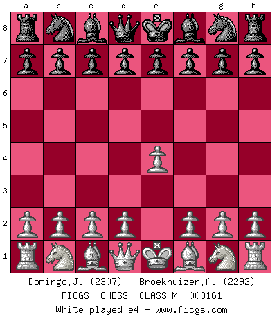 Last move : Be2 2026 January 8 22:58:32 White clock - 71 days 10:36:22 Black clock - 43 days 18:58:00 [Event "FICGS__CHESS__CLASS_M__000161"] [Site "FICGS"] [Date "2025.12.02"] [Round "1"] [White "Domingo,Jordi"] [Black "Broekhuizen,A. T. S."] [Result "*"] [WhiteElo "2307"] [BlackElo "2292"] 1.e4 e5 2.Nf3 Nf6 3.Nxe5 d6 4.Nf3 Nxe4 5.d4 d5 6.Bd3 Be7 7.O-O Nc6 8.Nbd2 Nxd2 9.Qxd2 O-O 10.c3 Bd6 11.h3 Qf6 12.Qd1 h6 13.Nh2 Bxh2+ 14.Kxh2 Bf5 15.Be2 * Follow this game move after move (download)Chess is life. (Bobby Fischer) Immer nach dem besten Zug zu suchen ist ziemlich unpraktisch. (Nigel Short) Buenas posiciones no logran ganar juegos, buenas movidas sí. (Gerald Abrahams) La victoire dans une partie d'Echecs appartient la plupart du temps à celui qui voit un peu plus loin que l'adversaire. (Lasker) Always two there are. No more no less. A master, and an apprentice. (Master Yoda in Star Wars ep.1)