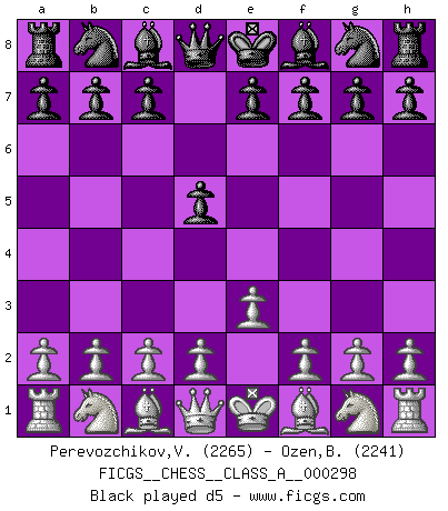 Last move : 1/2-1/2 2026 January 11 12:44:15 [Event "FICGS__CHESS__CLASS_A__000298"] [Site "FICGS"] [Date "2025.12.05"] [Round "1"] [White "Perevozchikov,Vjacheslav"] [Black "Ozen,Bahadir"] [Result "1/2-1/2"] [WhiteElo "2265"] [BlackElo "2241"] 1.e3 d5 2.c4 e6 3.Nc3 Nf6 4.Nf3 Be7 5.d4 O-O 6.Qc2 b6 7.cxd5 exd5 8.Be2 c5 9.O-O Nc6 10.b3 cxd4 11.Nxd4 Nxd4 12.exd4 Bb7 13.Bf4 Rc8 14.Qb2 Bb4 15.Rfc1 Qe7 16.Nb5 Bc6 17.a3 Bxb5 18.Bxb5 Rxc1+ 19.Qxc1 Bd6 20.Qe3 Qxe3 1/2-1/2 Follow this game move after move (download)Best by test: 1. e4 (Bobby Fischer) Im Hotelzimmer gab es nur zwei Schaben. (Über die Turnierbedingungen) (Peter Swidler) Cuando la partida de Ajedrez termina, el Peón y el Rey regresan a la misma caja. (Irish saying) Nous vivons dans un monde échiquéen : chaque jour qui passe est un défi à relever. (Philosophe Sasha) The only thing that matters is the evidence. (Horatio Caine, C.S.I. Miami)