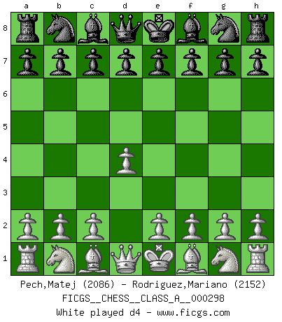 Last move : Bb7 2026 January 19 19:32:57 White clock - 40 days 23:46:11 Black clock - 73 days 06:05:37 [Event "FICGS__CHESS__CLASS_A__000298"] [Site "FICGS"] [Date "2025.12.05"] [Round "1"] [White "Pech,Matej"] [Black "Rodriguez,Mariano"] [Result "*"] [WhiteElo "2086"] [BlackElo "2152"] 1.d4 Nf6 2.c4 e6 3.Nc3 Bb4 4.e3 O-O 5.Bd3 d5 6.Nf3 c5 7.O-O cxd4 8.exd4 dxc4 9.Bxc4 b6 10.Qe2 Bb7 11.* Follow this game move after move (download)Any material change in a position must come about by mate, a capture, or a Pawn promotion. (Purdy) Es hat in meinem Leben Zeiten gegeben, da ich sehr nahe daran war zu glauben, daß ich auch nicht eine einzige Schachpartie verlieren könnte. (José Raúl Capablanca) Yo adoro todas la posiciones. Denme una partida posicional difícil, y la jugaré. Pero posiciones totalmente ganadas, no las tolero. (Hein Donner) Le temps de noter son nom sur la feuille de partie, j'étais déjà en zeitnot ! D'un modeste amateur apparié lors de la première ronde d'un open contre le grand-maître Azmaïparashvili. Creativity involves breaking out of established patterns in order to look at things in a different way. (Edward De Bono)