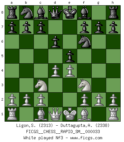 Last move : Qg4 2026 March 12 10:24:36 White clock - 57 days 17:19:29 Black clock - 14 days 12:32:48 [Event "FICGS__CHESS__RAPID_SM__000033"] [Site "FICGS"] [Date "2025.12.09"] [Round "1"] [White "Ligon,Scott"] [Black "Duttagupta,Aniruddha"] [Result "*"] [WhiteElo "2313"] [BlackElo "2338"] 1.e4 d6 2.d4 Nf6 3.Nc3 e5 4.Nf3 exd4 5.Nxd4 Be7 6.Bf4 O-O 7.Qd2 Nc6 8.O-O-O Nxd4 9.Qxd4 Be6 10.f3 a6 11.g4 b5 12.h4 c5 13.Qe3 b4 14.Na4 Qc7 15.g5 Nh5 16.Bh2 g6 17.b3 Rfe8 18.Nb2 Ng7 19.Kb1 Bf8 20.Qd2 Qc6 21.Nc4 Ra7 22.Be2 Rea8 23.Nxd6 Rd8 24.Qd3 c4 25.Qe3 Rad7 26.Nxc4 Rxd1+ 27.Rxd1 Rxd1+ 28.Bxd1 Bxc4 29.bxc4 a5 30.Be2 Ne6 31.Qa7 a4 32.a3 bxa3 33.Be5 h6 34.gxh6 Bxh6 35.Ka2 Bf8 36.Qa5 Qb7 37.Ba1 Bc5 38.Bd3 Qb8 39.e5 Kg7 40.f4 Qh8 41.Qe1 Qh5 42.Qg3 Kf8 43.Bc3 Ke7 44.Qh2 Qg4 45.* Follow this game move after move (download)It is peculiar but a fact nevertheless, that gamblers in chess always have enthusiastic followers. (Botvinnik) Es ist nicht das erste mal, dass sich die FIDE dem Arabischen Geld gebeugt hat (über die FIDE WM 2004 in Lybien). (Larry Evans) Por la belleza de sus partidas, la claridad de su juego y lo brillante de sus ideas, Fischer se creó el mismo como un artista de la misma estatura como Brahms, Rembrandt y Shakespeare. (David Levy) Il a essayé de se convaincre qu'il pourrait empêcher toutes les erreurs et ne jamais perdre. L'horreur ! Gary Kasparov au sujet de Robert Fischer. A married woman is like a fish riding a bicycle. (Rodolfo d'Ettorre)