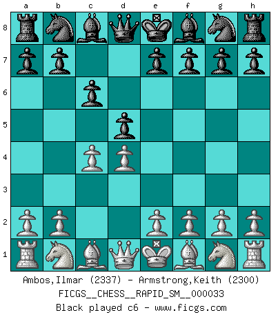 Last move : e5 2026 January 26 7:20:27 White clock - 26 days 12:00:25 Black clock - 29 days 00:13:18 [Event "FICGS__CHESS__RAPID_SM__000033"] [Site "FICGS"] [Date "2025.12.09"] [Round "1"] [White "Ambos,Ilmar"] [Black "Armstrong,Keith"] [Result "*"] [WhiteElo "2337"] [BlackElo "2300"] 1.d4 d5 2.c4 c6 3.Nf3 Nf6 4.Nc3 e6 5.Bg5 h6 6.Bxf6 Qxf6 7.e3 Nd7 8.Bd3 dxc4 9.Bxc4 g6 10.O-O Bg7 11.Ne4 Qe7 12.Qc2 O-O 13.Bb3 a5 14.h4 Kh8 15.h5 gxh5 16.Ng3 a4 17.Bxa4 Ra5 18.Rac1 Rg8 19.Bb3 h4 20.Ne2 e5 21.* Follow this game move after move (download)What is the object of playing a gambit opening?... To acquire a reputation of being a dashing player at the cost of losing a game. (Siegbert Tarrasch) Glücklicherweise sind Großmeister Ruben Fines reine Schachbücher weniger phallozentrisch [als seine Schachpsychologie] und deswegen auch weniger lächerlich. (Nigel Short) ¿Que sería del Ajedrez sin errores graciosos?. (Kurt Richter) Le profane ne songe pas à la somme de jouissance dont il se prive, qui méconnaît ce jeu aux ressources aussi variées que passionnantes. (Jean-Marie Jeanton-Lamarche) No enterprise is more likely to succeed than one concealed from the enemy until it is ripe for execution. (Niccolo Machiavelli)