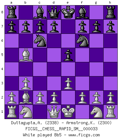 Last move : Re2 2026 March 10 19:13:13 White clock - 18 days 20:55:43 Black clock - 21 days 19:20:52 [Event "FICGS__CHESS__RAPID_SM__000033"] [Site "FICGS"] [Date "2025.12.09"] [Round "1"] [White "Duttagupta,Aniruddha"] [Black "Armstrong,Keith"] [Result "*"] [WhiteElo "2338"] [BlackElo "2300"] 1.b3 e5 2.Bb2 Nc6 3.e3 Nf6 4.Bb5 Qe7 5.Ne2 b6 6.d4 Bb7 7.O-O h5 8.c4 exd4 9.exd4 O-O-O 10.h3 Nb4 11.Nbc3 Ng4 12.Bc1 Qd6 13.f4 Nh6 14.Rf2 Qg6 15.f5 Nxf5 16.a3 Nc6 17.b4 Be7 18.d5 Bh4 19.Rf1 Bf6 20.dxc6 dxc6 21.Qc2 Nd4 22.Qxg6 fxg6 23.Rxf6 gxf6 24.Ba4 Rhe8 25.Kf2 g5 26.Ra2 Re5 27.Nxd4 Rxd4 28.Re2 * Follow this game move after move (download)It's always better to sacrifice your opponent's men. (Savielly Tartakover) Wenn Capablanka heute auf der Schachbühne erscheinen würde, hätte er ein halbes Jahr gebraucht um sich die Schachtheorie anzueignen. Und dann hätte er alles und jeden besiegt. (Mikhail Moiseyevich Botvinik) El Ajedrez es sobre todo, ¡una pelea!. (Emanuel Lasker) L'ordinateur a tué l'originalité. Il n'y a plus guère d'aventures sur l'échiquier. (Jacob Murray) The quality of decision is like the well-timed swoop of a falcon which enables it to strike and destroy its victim. (Sun Tzu)