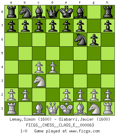 Last move : 1-0 2007 November 24 7:35:15 [Event "FICGS__CHESS__CLASS_E__000063"] [Site "FICGS"] [Date "2007.10.11"] [Round "1"] [White "Lemay,Simon"] [Black "Olabarri,Javier"] [Result "1-0"] [WhiteElo "1600"] [BlackElo "1600"] 1.c4 Nf6 2.d4 g6 3.Nc3 1-0 This chess game has been lost on time (started : 2007.10.11 14:5:53) English, 1...Nf6 (Anglo-Indian defense) Player White won this chess game. Follow this game move after move (download)The game of chess is the touchstone of the intellect. (Goethe) Ich erzeugte keinen Neid, da mich die Schachspieler als Musiker und die Musiker als Schachspieler betrachteten. (Mark Taimanov) La batalla por la última verdad nunca sera ganada. Y es por eso que el Ajedrez es tan fascinante. (Hans Kmoch) J'apprécie les joueurs d'est-indienne, c'est grâce à eux que je nourris ma famille depuis tant d'années. (Petrosian) Control your own destiny or someone else will. (Jack Welch)