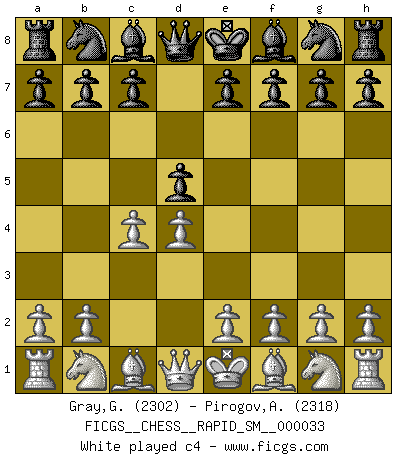 Last move : Ne3 2026 January 24 5:22:33 White clock - 25 days 00:44:44 Black clock - 26 days 15:43:33 [Event "FICGS__CHESS__RAPID_SM__000033"] [Site "FICGS"] [Date "2025.12.09"] [Round "1"] [White "Gray,Garvin"] [Black "Pirogov,Andrey Mikhaylovich"] [Result "*"] [WhiteElo "2302"] [BlackElo "2318"] 1.d4 d5 2.c4 c6 3.Nf3 Nf6 4.Nc3 dxc4 5.a4 Bf5 6.Ne5 Nbd7 7.Nxc4 Qc7 8.g3 e5 9.dxe5 Nxe5 10.Bf4 Nfd7 11.Bg2 g5 12.Ne3 * Follow this game move after move (download)There are two classes of men; those who are content to yield to circumstances and who play whist; those who aim to control circumstances, and who play Chess. (Mortimer Collins) Oft bringt ein stiller Zug das Erdbeben. (Richard Reti) Vive, pierde y aprende al observar a tu oponente como gana. (Amber Steenbock) Les Echecs ne sont pas pour les âmes timides. Ils requièrent un homme entier, qui ne s'arrête pas aveuglément à ce qui a été déjà établi, mais qui tente individuellement de sonder les profondeurs du jeu. (W. Steinitz) You cannot beat a roulette table unless you steal money from it. (Albert Einstein)