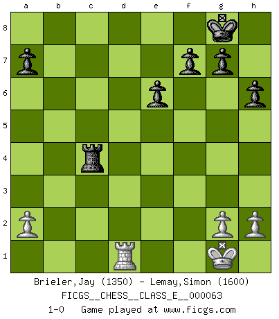 Last move : 1-0 2007 November 9 2:55:35 [Event "FICGS__CHESS__CLASS_E__000063"] [Site "FICGS"] [Date "2007.10.11"] [Round "1"] [White "Brieler,Jay"] [Black "Lemay,Simon"] [Result "1-0"] [WhiteElo "1350"] [BlackElo "1600"] 1.e4 c5 2.Nf3 Nc6 3.d4 cxd4 4.Nxd4 Nf6 5.Nc3 e6 6.Be2 d5 7.Be3 dxe4 8.Nxc6 Qxd1+ 9.Rxd1 bxc6 10.O-O Be7 11.f3 exf3 12.Bxf3 Nd5 13.Nxd5 cxd5 14.Be2 O-O 15.Rf3 Rb8 16.b3 Bd7 17.c4 Bc6 18.cxd5 Bxd5 19.Rh3 Rfc8 20.Bd3 h6 21.Rf1 Bc5 22.Bxc5 Rxc5 23.Rh5 Rbc8 24.Bc4 Bxc4 25.Rxc5 Rxc5 26.bxc4 Rxc4 27.Rd1 1-0 Sicilian defense Kingside Castling by player White (move 10) Kingside Castling by player Black (move 14) Player White won this chess game. Follow this game move after move (download)All Chess players should have a hobby. (Savielly Tartakower) Gegen einen Schachcomputer zu verlieren ist wie Löcher in den Strümpfen zuhaben. Es ist nicht peinlich, solange man der einzige ist der es weiß. (Anonymous) El Ajedrez no es como la vida... ¡tiene reglas!. (Mark Pasternak) La conception d'un plan est le processus par lequel un joueur exploite les avantages de sa position tout en s'efforçant d'en réduire au minimum les inconvénients. Afin de garantir le succès, un plan doit toujours se fonder sur un diagnostic objectif des particularités d'une position. La conception d'un plan est d'autant plus difficile que la position est équilibrée, et grandement facilitée lorsqu'il n'existe qu'un seul plan susceptible de répondre aux exigences de la position. (Harry Golombek) Without deviation from the norm, progress is not possible. (Frank Zappa)