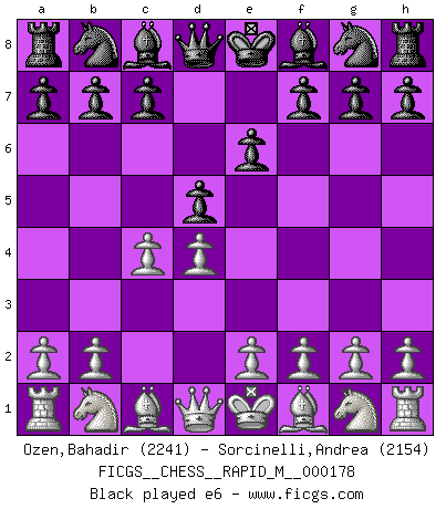 Last move : 1/2-1/2 2026 January 10 17:27:13 [Event "FICGS__CHESS__RAPID_M__000178"] [Site "FICGS"] [Date "2025.12.12"] [Round "1"] [White "Ozen,Bahadir"] [Black "Sorcinelli,Andrea"] [Result "1/2-1/2"] [WhiteElo "2241"] [BlackElo "2154"] 1.d4 d5 2.c4 e6 3.Nf3 Nf6 4.Nc3 c6 5.Bg5 Be7 6.e3 Nbd7 7.Bd3 h6 8.Bh4 O-O 9.O-O Ne4 10.Bxe7 Nxc3 11.Bxd8 Nxd1 12.Rfxd1 Rxd8 13.Rac1 dxc4 14.Rxc4 Nb6 15.R4c1 Kf8 16.b3 Bd7 17.g4 a5 18.a3 Be8 19.h4 Rac8 20.Rc5 Rd5 21.Rc3 f5 22.e4 fxe4 23.Bxe4 Rd6 24.Re1 Nd7 25.Kg2 1/2-1/2 Follow this game move after move (download)Whoever sees no other aim in the game than that of giving checkmate to one's opponent will never become a good Chess player. (Euwe) Ein Springer auf f6 gegen die eigene Rochadestellung ist schlimmer als ein rostiger Nagel im Knie. (Efim Bogoljubov) Un Peón pasado es un criminal, quién debe ser mantenido bajo candado y llave. Leves medidas, tales como vigilancia policiaca, no son suficientes. (Aaron Nimzovich) Que feriez-vous si vous étiez en train de jouer aux échecs et que la fin du monde arrive ? Je continuerais à jouer. (Saint Borromée) Follow your passion, and success will follow you. (Arthur Buddhold)