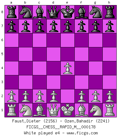 Last move : Qxf7 2026 January 19 11:35:41 Bahadir Ozen ... is in vacation until 2026 January 30 10:44:16 White clock - 37 days 15:44:44 Black clock - 27 days 09:45:06 [Event "FICGS__CHESS__RAPID_M__000178"] [Site "FICGS"] [Date "2025.12.12"] [Round "1"] [White "Faust,Dieter"] [Black "Ozen,Bahadir"] [Result "*"] [WhiteElo "2156"] [BlackElo "2241"] 1.e4 c5 2.Nf3 d6 3.d4 cxd4 4.Nxd4 Nf6 5.f3 e5 6.Nb3 d5 7.Bg5 d4 8.c3 Nc6 9.cxd4 Bb4+ 10.Bd2 Nxe4 11.Bxb4 Qh4+ 12.g3 Nxg3 13.hxg3 Qxh1 14.Ba3 Bh3 15.N1d2 O-O-O 16.Qc2 Bxf1 17.O-O-O Kb8 18.Rxf1 Qg2 19.Qe4 exd4 20.Qf4+ Ka8 21.Qxf7 * Follow this game move after move (download)The laws of Chess do not permit a free choice: you have to move whether you like it or not. (Emanuel Lasker) Ich hatte Zahnschmerzen im ersten Spiel. In der zweiten Partie tat mir der Kopf weh. In der dritten war es eine Rheuma-Attacke und während der vierten fühlte ich mich nicht gut. Und in der fünften? Nun, man muss doch nicht jedes Spiel gewinnen, oder? (Savielly Grigorievitsch Tartakower) Debes de llevar a tu oponente hacia un profundo y obscuro bosque donde 2+2=5, y el camino que conduce a la salida es suficientemente ancho para solamente uno. (Mikhail Tal) Donnez-moi un Cavalier en 6e et je gagnerais toutes mes parties. (Steinitz) Nobody is always a winner, and anybody who says he is, is either a liar or doesn't play poker. (Amarillo Slim)