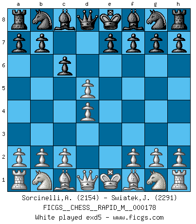 Last move : 1/2-1/2 2026 January 16 19:53:4 [Event "FICGS__CHESS__RAPID_M__000178"] [Site "FICGS"] [Date "2025.12.12"] [Round "1"] [White "Sorcinelli,Andrea"] [Black "Swiatek,Janusz"] [Result "1/2-1/2"] [WhiteElo "2154"] [BlackElo "2291"] 1.e4 c6 2.d4 d5 3.exd5 cxd5 4.Bd3 Nc6 5.c3 Qc7 6.h3 e5 7.dxe5 Nxe5 8.Bc2 Nf6 9.Nf3 Nxf3+ 10.Qxf3 Bd6 11.Be3 O-O 12.Nd2 Be5 13.O-O h6 14.Rfe1 Bd7 15.Nb3 Rfe8 16.Nd4 a5 17.a4 Ra6 18.Bd3 R6a8 19.Nb5 Qb8 20.Nd4 1/2-1/2 Follow this game move after move (download)Nowadays, when you're not a grandmaster at 14, you can forget about it. (Anand Viswanathan) Ich erzeugte keinen Neid, da mich die Schachspieler als Musiker und die Musiker als Schachspieler betrachteten. (Mark Taimanov) La batalla por la última verdad nunca sera ganada. Y es por eso que el Ajedrez es tan fascinante. (Hans Kmoch) Les Cavaliers se révèlent fort utiles dans les positions fermées. D'habitude, les Fous sont un peu plus forts que les Cavaliers dans les positions ouvertes. Qu'on le veuille ou non, il restera toujours des exceptions ! Patience, use the Force, think ! (Obi-Wan Kenobi in Star Wars ep.2)