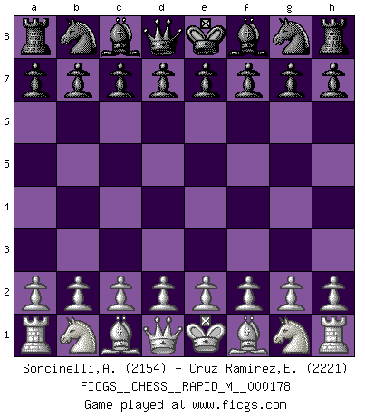 Last move : Qh5 2026 January 27 9:51:18 White clock - 47 days 13:36:11 Black clock - 7 days 12:05:36 [Event "FICGS__CHESS__RAPID_M__000178"] [Site "FICGS"] [Date "2025.12.12"] [Round "1"] [White "Sorcinelli,Andrea"] [Black "Cruz Ramirez,Eliecer"] [Result "*"] [WhiteElo "2154"] [BlackElo "2221"] 1.e4 e5 2.Nf3 Nc6 3.Bb5 a6 4.Ba4 Nf6 5.O-O Be7 6.Re1 b5 7.Bb3 O-O 8.a4 Bb7 9.d3 d6 10.Nbd2 Na5 11.Ba2 c5 12.Nf1 bxa4 13.Ne3 Bc8 14.Nh4 a3 15.bxa3 Nxe4 16.dxe4 Bxh4 17.Bd5 Rb8 18.Bd2 Bd7 19.Nf5 Nc6 20.Bxc6 Bxc6 21.Qh5 * Follow this game move after move (download)When you don't know what to do, wait for your opponent to get an idea - it's sure to be wrong. (Tarrasch) Die starken Figuren des Gegners muss man abtauschen. (José Raúl Capablanca) Robert Fischer es la ley hacia si mismo. (Larry Evans) Même si l'adversaire joue le coup analysé précédemment, recommencez l'analyse en voyant la nouvelle position. Première règle de Blumenfeld A proverb is a short sentence based on long experience. (Miguel de Cervantes)
