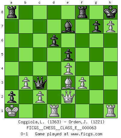 Last move : 0-1 2007 December 3 15:36:7 [Event "FICGS__CHESS__CLASS_E__000063"] [Site "FICGS"] [Date "2007.10.11"] [Round "1"] [White "Coggiola,Leandro Damian"] [Black "Orden,Jorge"] [Result "0-1"] [WhiteElo "1363"] [BlackElo "1221"] 1.e4 c5 2.Nf3 d6 3.d4 cxd4 4.Nxd4 Nf6 5.Nc3 e6 6.Be2 Be7 7.Be3 Nc6 8.f3 O-O 9.Qd2 a6 10.O-O-O Qc7 11.h4 Nxd4 12.Bxd4 b5 13.g4 e5 14.Be3 b4 15.Nd5 Nxd5 16.Qxd5 Be6 17.Qd2 a5 18.g5 b3 19.axb3 Bxb3 20.Kb1 Bc4 21.h5 Bxe2 22.Qxe2 a4 23.g6 fxg6 24.hxg6 a3 25.gxh7+ Kh8 26.b3 a2+ 27.Ka1 Qc3+ 0-1 Sicilian : Scheveningen, 6.Be2 Kingside Castling by player Black (move 8) Queenside Castling by player White (move 10) Player Black won this chess game. Follow this game move after move (download)Chess is really ninety nine percent calculation. (Soltis) Das typische an einem Großmeister ist, daß er eine gewonnene Position schnell und schmerzlos gewinnt. (Irving Chernev) Antes de los Finales, los dioses han colocado el Juego Medio. (Siegbert Tarrasch) Il s'avisa de me proposer d'apprendre les échecs qu'il jouait un peu... me voilà forcené des échecs. J'achète un échiquier, je m'enferme dans ma chambre, j'y passe des jours et des nuits à vouloir apprendre par cur toutes les parties. (Jean-Jacques Rousseau, Confessions) If passion drives you, let reason holds the reins. (Benjamin Franklin)