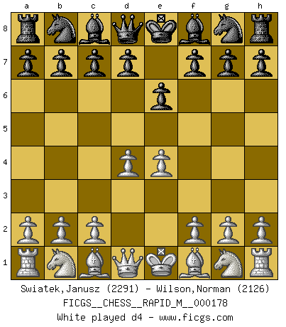 Last move : h5 2026 February 9 19:59:6 White clock - 20 days 04:08:48 Black clock - 45 days 01:23:41 [Event "FICGS__CHESS__RAPID_M__000178"] [Site "FICGS"] [Date "2025.12.12"] [Round "1"] [White "Swiatek,Janusz"] [Black "Wilson,Norman"] [Result "*"] [WhiteElo "2291"] [BlackElo "2126"] 1.e4 e6 2.d4 d5 3.Nc3 Nf6 4.e5 Nfd7 5.f4 c5 6.Nf3 Nc6 7.Be3 a6 8.Ne2 Be7 9.c3 O-O 10.Qc2 f6 11.g3 Qe8 12.exf6 Nxf6 13.dxc5 Ng4 14.Qd2 Qg6 15.Bg2 Nxe3 16.Qxe3 Qc2 17.b3 Qb2 18.O-O Qa3 19.Ned4 Bxc5 20.Rf2 Bd7 21.Bh3 Rf6 22.Re1 Rc8 23.Rc2 Ba7 24.Qd3 Rh6 25.Bg4 Rg6 26.h3 Nxd4 27.cxd4 Rxc2 28.Qxc2 Qd6 29.Rc1 Bb6 30.Kg2 Rf6 31.h4 Qe7 32.h5 * Follow this game move after move (download)Man is a frivolous, a specious creature, and like a Chess player, cares more for the process of attaining his goal than for the goal itself. (Dostoyevsky) Es macht mich traurig, wenn ich sehe, dass Golfprofis mehr verdienen als Schachsportler. Obwohl ich davon überzeugt bin, dass wir Schachspieler viel härter trainieren müssen als die Golfer. (Alexandra Kosteniuk) ¿Quién es tu oponente esta tarde? Esta tarde mi oponente son las piezas negras. (Akiba Rubinstein) En blitz, le Cavalier l'emporte sur le Fou. (Vlastimil Hort) He who laughs last probably does not get the joke. (Unknown)