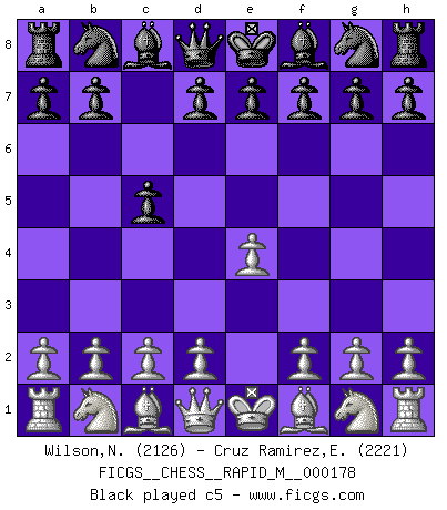 Last move : fxg6 2026 January 27 5:6:38 White clock - 44 days 05:26:50 Black clock - 13 days 20:14:24 [Event "FICGS__CHESS__RAPID_M__000178"] [Site "FICGS"] [Date "2025.12.12"] [Round "1"] [White "Wilson,Norman"] [Black "Cruz Ramirez,Eliecer"] [Result "*"] [WhiteElo "2126"] [BlackElo "2221"] 1.e4 c5 2.Nf3 Nc6 3.Nc3 d6 4.d4 cxd4 5.Nxd4 Nf6 6.Bg5 e6 7.Qd2 a6 8.O-O-O Bd7 9.f3 Nxd4 10.Qxd4 Bc6 11.Qf2 Be7 12.h4 Qc7 13.Qg3 b5 14.a3 h6 15.Bxf6 Bxf6 16.Qxd6 Qb7 17.g4 Rb8 18.Be2 Be7 19.Qe5 O-O 20.Na2 a5 21.g5 h5 22.g6 fxg6 23.* Follow this game move after move (download)I am still a victim of Chess. It has all the beauty of art and much more. It cannot be commercialized. Chess is much purer than art in its social position. (Marcel Duchamp) Offensichtlich kennt Kasparow nichts anderes als Schach, und ich könnte 500 weitere Spieler dieser Sorte benennen. (Judith Polgar) El Ajedrez es una guerra en un tablero. El objetivo es aplastar la mente del oponente. (Bobby Fischer) Shah mat. Le roi est mort. Cri de fierté d'un joueur venant de terrasser son adversaire, courtoisement, sans effusion de sang. Nowadays, anyone who cannot speak English and is incapable of using the Internet is regarded as backward. (Al-Waleed bin Talal)