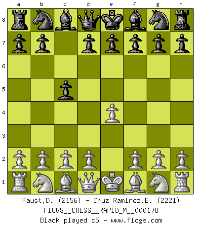 Last move : Be3 2026 January 27 9:21:41 White clock - 38 days 23:12:20 Black clock - 14 days 02:25:00 [Event "FICGS__CHESS__RAPID_M__000178"] [Site "FICGS"] [Date "2025.12.12"] [Round "1"] [White "Faust,Dieter"] [Black "Cruz Ramirez,Eliecer"] [Result "*"] [WhiteElo "2156"] [BlackElo "2221"] 1.e4 c5 2.Nf3 Nc6 3.Bb5 a6 4.Bxc6 bxc6 5.O-O d6 6.h3 e5 7.c3 Nf6 8.Re1 Be7 9.d4 exd4 10.cxd4 cxd4 11.Nxd4 Bd7 12.Qc2 h6 13.Bf4 Rc8 14.Nc3 O-O 15.Rad1 Re8 16.Nb3 d5 17.e5 Nh7 18.Na4 Nf8 19.Qc3 Ne6 20.Be3 * Follow this game move after move (download)For surely of all the drugs in the world, Chess must be the most permanently pleasurable. (Assiac) Bogoljubow: Matt in vier Zügen! Tartakower: Ich verbitte mir jede Belästigung! (Savielly Grigorievitsch Tartakower) Solo puedes ser bueno en el Ajedrez si amas al juego. (Bobby Fischer) On peut tirer plus d'utilité d'une partie perdue que de 100 parties gagnées. (Capablanca) There are two major products that came out of Berkeley: LSD and UNIX. We do not believe this is to be a coincidence. (Jeremy S. Anderson)