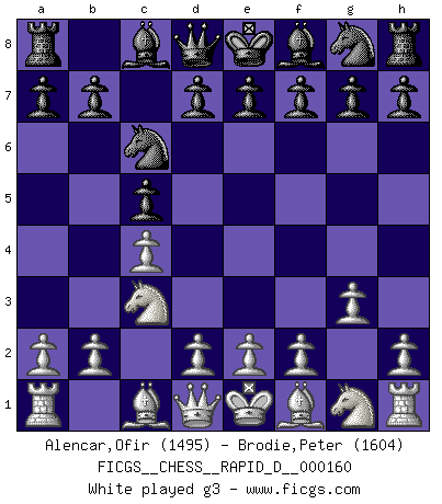 Last move : b4 2026 January 29 9:11:7 White clock - 39 days 20:02:29 Black clock - 15 days 12:00:59 [Event "FICGS__CHESS__RAPID_D__000160"] [Site "FICGS"] [Date "2025.12.12"] [Round "1"] [White "Alencar,Ofir"] [Black "Brodie,Peter"] [Result "*"] [WhiteElo "1495"] [BlackElo "1604"] 1.c4 c5 2.Nc3 Nc6 3.g3 g6 4.Bg2 Bg7 5.Bxc6 dxc6 6.Ne4 b6 7.Rb1 Nf6 8.Nxf6+ Bxf6 9.b3 Bf5 10.d3 O-O 11.Bb2 Bxb2 12.Rxb2 Qd4 13.Qc2 Rae8 14.Nf3 Qd6 15.Nh4 Bd7 16.f4 f5 17.Nf3 Kh8 18.Qc3+ Qf6 19.Qxf6+ Rxf6 20.Ne5 Bc8 21.h4 h5 22.b4 * Follow this game move after move (download)Up to this point White has been following well-known analysis. But now he makes a fatal error: he begins to use his own head. (Siegbert Tarrasch) Es gibt Leute, die glauben, alles wäre vernünftig, was man mit einem ernsthaften Gesicht tut. (Georg Christoph Lichtenberg) Si un gobernante no entiende al Ajedrez, ¿como puede governar él un reinado?. (El Rey Khusros II) Les Cavaliers se révèlent fort utiles dans les positions fermées. D'habitude, les Fous sont un peu plus forts que les Cavaliers dans les positions ouvertes. Qu'on le veuille ou non, il restera toujours des exceptions ! The worth of a book is to be measured by what you can carry away from it. (James Bryce)