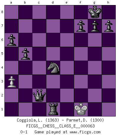Last move : 0-1 2008 January 10 17:7:15 [Event "FICGS__CHESS__CLASS_E__000063"] [Site "FICGS"] [Date "2007.10.11"] [Round "1"] [White "Coggiola,Leandro Damian"] [Black "Parmet,Daniel"] [Result "0-1"] [WhiteElo "1363"] [BlackElo "1300"] 1.e4 e5 2.Nf3 Nc6 3.Bb5 a6 4.Ba4 Nf6 5.O-O Be7 6.Re1 b5 7.Bb3 d6 8.c3 Na5 9.Bc2 c5 10.d4 Qc7 11.Nbd2 O-O 12.Nb3 Nxb3 13.Bxb3 Bg4 14.h3 Bxf3 15.gxf3 Rad8 16.Kh2 d5 17.Bc2 dxe4 18.fxe4 exd4 19.f4 dxc3 20.Qf3 cxb2 21.Bxb2 Rd2+ 22.Re2 Rxe2+ 23.Qxe2 Qxf4+ 24.Kh1 Rd8 25.Bc3 Qg3 26.e5 Qxc3 27.Rc1 Qxh3+ 28.Qh2 Qxh2+ 29.Kxh2 Ng4+ 30.Kg3 Nxe5 31.Re1 Bh4+ 32.Kxh4 Nf3+ 33.Kg3 Nxe1 34.Kf2 Nxc2 35.Kg2 Rd3 36.Kf2 c4 37.Ke2 Nd4+ 38.Kf2 c3 39.a3 c2 40.Kg2 c1Q 41.Kf2 Qc2+ 42.Kf1 Rd1+ 0-1 Ruy Lopez : Closed Kingside Castling by player White (move 5) Kingside Castling by player Black (move 11) Promotion Queen by player Black (move 40) Player Black won this chess game. Follow this game move after move (download)Methodical thinking is of more use in Chess than inspiration. (C. J. S. Purdy) Die Fehler sind da, Sie warten nur darauf gemacht zu werden. (Savielly Grigorievitsch Tartakower) Hay dos clases de hombres: aquellos que se conforman en dejarse llevar por las circunstancias y que juegan barajas y aquellos decididos a controlar las circunstancias y que juegan al Ajedrez. (Mortimer Collins) Les Echecs sont affaire de jugement sensible. Savoir quand frapper et quand esquiver. (Fischer) The age of a woman doesn't mean a thing. The best tunes are played on the oldest fiddles. (Ralph Waldo Emerson)